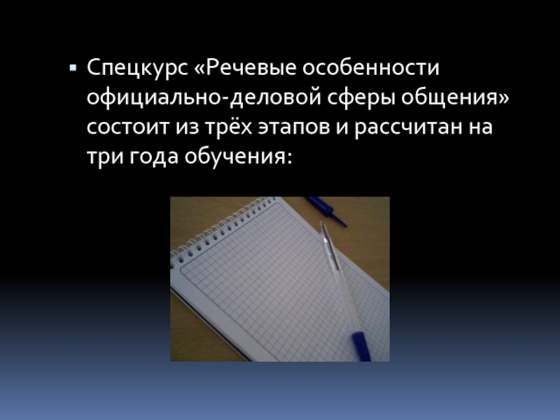Слайд 14Спецкурс «Речевые особенности официально-деловой сферы общения» состоит из трёх этапов и
