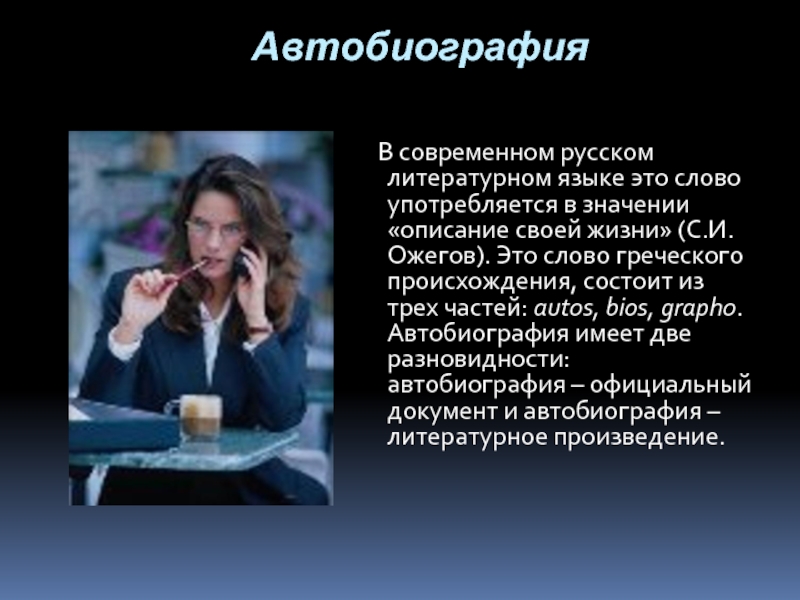 значении «описание своей жизни» (С.И. Ожегов). Это слово греческого происхождения, состоит из трех частей: autos, bios, grapho. Автобиография имеет две разновидности: автобиография – официальный документ и автобиография – литературное произведение.