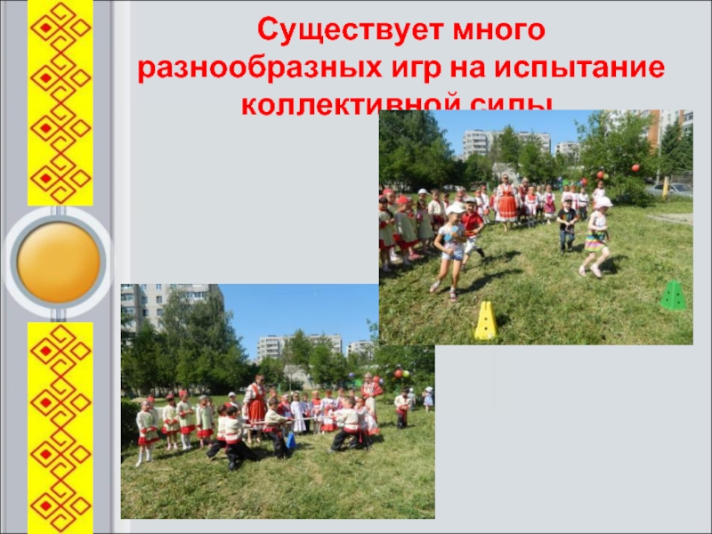 Слайд 10Существует много разнообразных игр на испытание коллективной силы.
