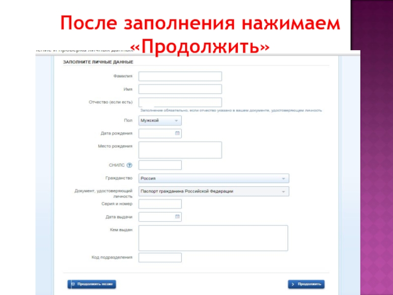 Слайд 10После заполнения нажимаем «Продолжить»