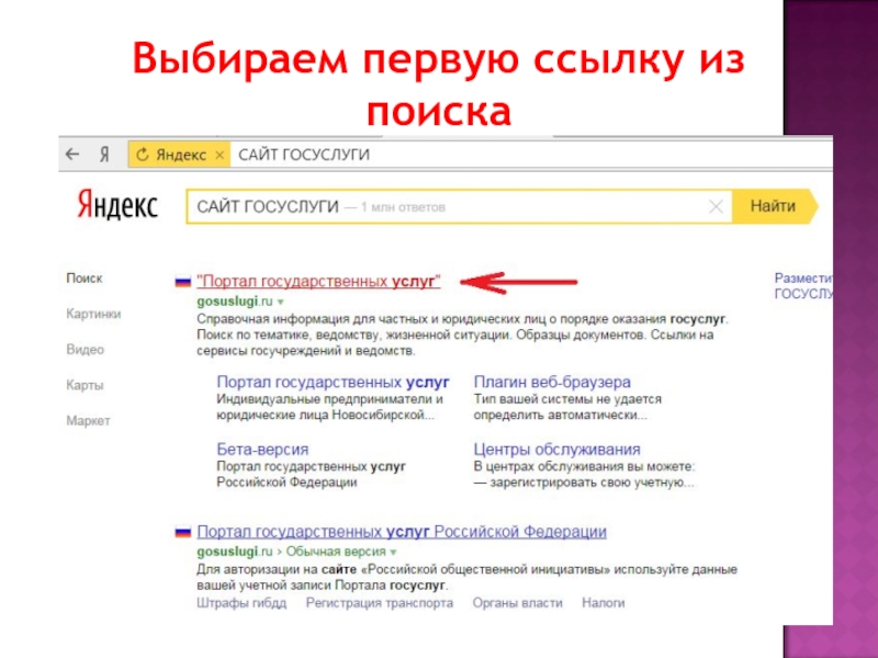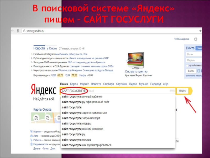Слайд 2В поисковой системе «Яндекс» пишем – САЙТ ГОСУСЛУГИ