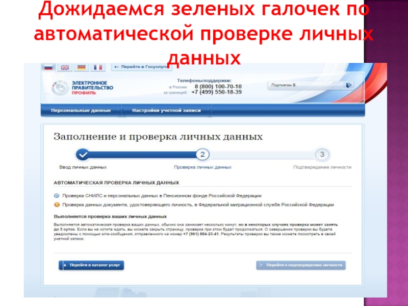 Слайд 11Дожидаемся зеленых галочек по автоматической проверке личных данных