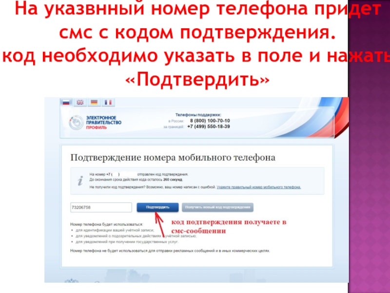 Слайд 6На указвнный номер телефона придет смс с кодом подтверждения.