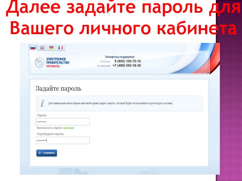 Слайд 7Далее задайте пароль для Вашего личного кабинета