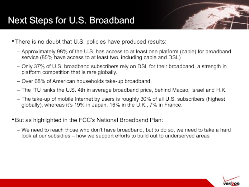 - минимальный набор качественных услуг связи на всей территории США (услуги местной и междугородной телефонной связи, Интернет со скоростью 4 Мбит/с- на выгрузку и 1 Мбит/с- на загрузку);