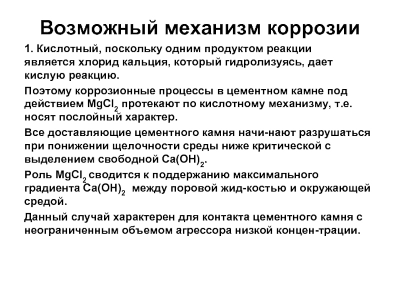 В результате химических реакций поровая жидкость обедняется щелочью, что приводит к нарушению термодинамического равновесия между твердой и жидкой фазами цементного камня. Продукты твердения продолжают растворяться и гидролизуются с выделением свободной Са(ОН)2. Прежде всего, разрушается твердая фаза, представленная кристаллическим гидратом окиси кальция, высокоосновными алюминатами, гидросиликатом и гидроферритом кальция. Следовательно, механизм сероводородной коррозии под действием растворенного сероводорода близок к кислотной коррозии.