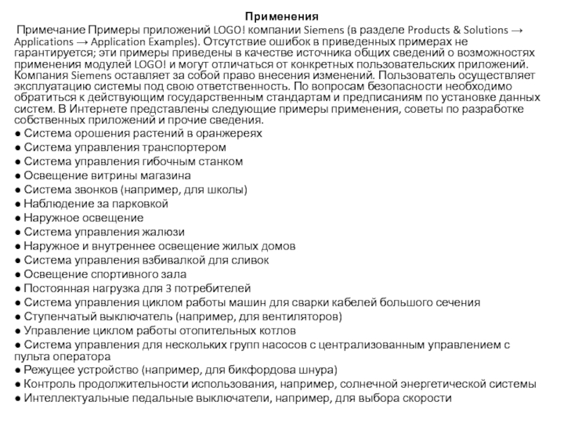 & Solutions → Applications → Application Examples). Отсутствие ошибок в приведенных примерах не гарантируется; эти примеры приведены в качестве источника общих сведений о возможностях применения модулей LOGO! и могут отличаться от конкретных пользовательских приложений. Компания Siemens оставляет за собой право внесения изменений. Пользователь осуществляет эксплуатацию системы под свою ответственность. По вопросам безопасности необходимо обратиться к действующим государственным стандартам и предписаниям по установке данных систем. В Интернете представлены следующие примеры применения, советы по разработке собственных приложений и прочие сведения.