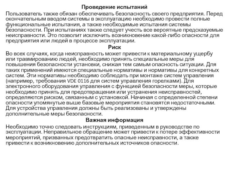 вводом системы в эксплуатацию необходимо провести полные функциональные испытания, а также необходимые испытания системы безопасности. При испытаниях также следует учесть все вероятные предсказуемые неисправности. Это позволит исключить возникновение какой-либо опасности для предприятия или людей в процессе эксплуатации.