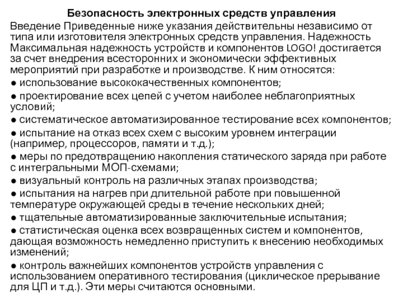 типа или изготовителя электронных средств управления. Надежность Максимальная надежность устройств и компонентов LOGO! достигается за счет внедрения всесторонних и экономически эффективных мероприятий при разработке и производстве. К ним относятся: