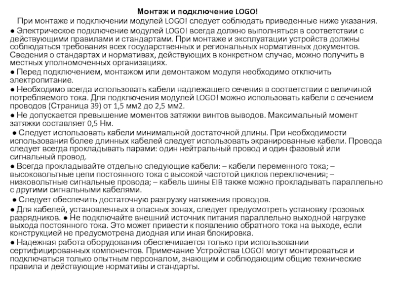 ● Надежная работа оборудования обеспечивается только при использовании сертифицированных компонентов. Примечание Устройства LOGO! могут монтироваться и подключаться только опытным персоналом, знающим и соблюдающим общие технические правила и действующие нормативы и стандарты.
