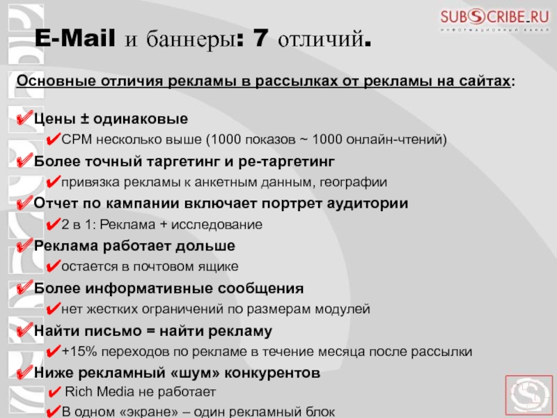 Основные отличия рекламы в рассылках от рекламы на сайтах: