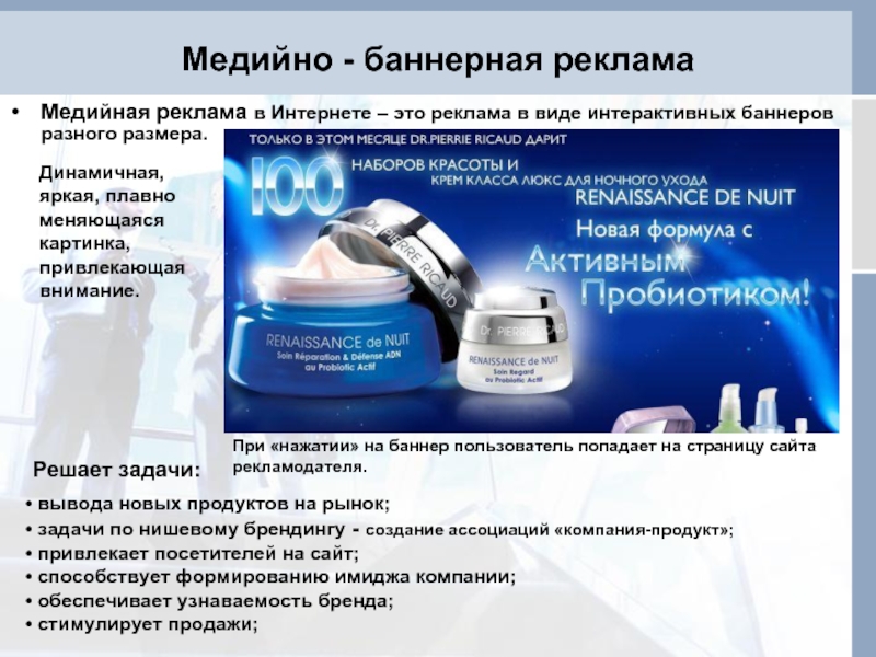 При «нажатии» на баннер пользователь попадает на страницу сайта рекламодателя.