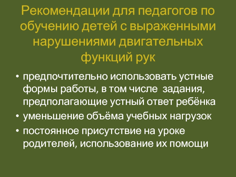 предпочтительно использовать устные формы работы, в том числе задания, предполагающие устный ответ ребёнка