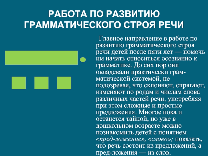 работе по развитию грамматического строя речи детей после пяти лет — помочь им начать относиться осознанно к грамматике. До сих пор они овладевали практически грамматической системой, не подозревая, что склоняют, спрягают, изменяют по родам и числам слова различных частей речи, употребляя при этом сложные и простые предложения. Многое пока и останется тайной, но уже в дошкольном возрасте можно познакомить детей с понятием «предложение», «слово»; показать, что речь состоит из предложений, а предложения — из слов.