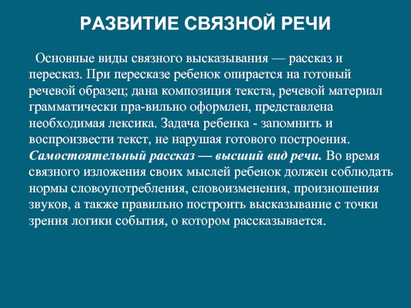 рассказ и пересказ. При пересказе ребенок опирается на готовый речевой образец; дана композиция текста, речевой материал грамматически правильно оформлен, представлена необходимая лексика. Задача ребенка - запомнить и воспроизвести текст, не нарушая готового построения. Самостоятельный рассказ — высший вид речи. Во время связного изложения своих мыслей ребенок должен соблюдать нормы словоупотребления, словоизменения, произношения звуков, а также правильно построить высказывание с точки зрения логики события, о котором рассказывается.