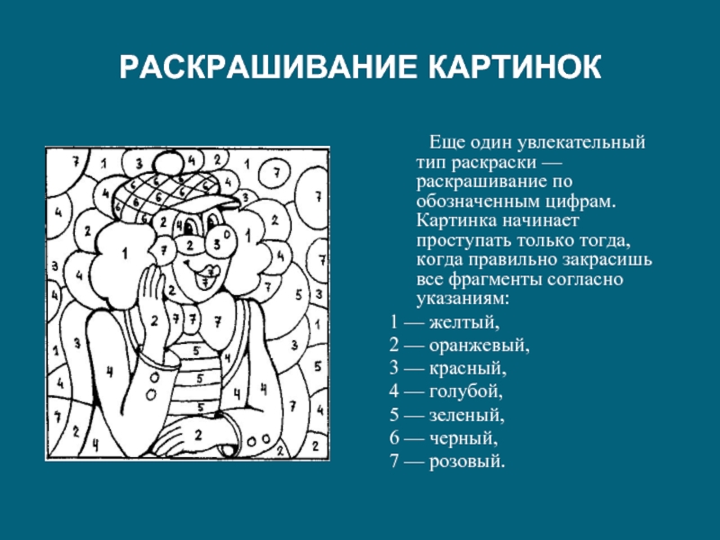 раскрашивание по обозначенным цифрам. Картинка начинает проступать только тогда, когда правильно закрасишь все фрагменты согласно указаниям: