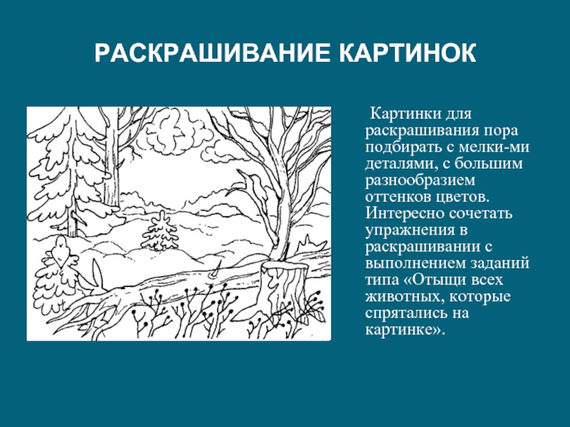 деталями, с большим разнообразием оттенков цветов. Интересно сочетать упражнения в раскрашивании с выполнением заданий типа «Отыщи всех животных, которые спрятались на картинке».
