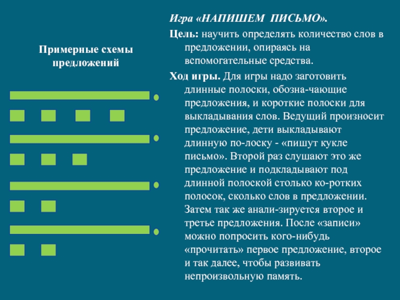 Ход игры. Для игры надо заготовить длинные полоски, обозначающие предложения, и короткие полоски для выкладывания слов. Ведущий произносит предложение, дети выкладывают длинную полоску - «пишут кукле письмо». Второй раз слушают это же предложение и подкладывают под длинной полоской столько коротких полосок, сколько слов в предложении. Затем так же анализируется второе и третье предложения. После «записи» можно попросить кого-нибудь «прочитать» первое предложение, второе и так далее, чтобы развивать непроизвольную память.