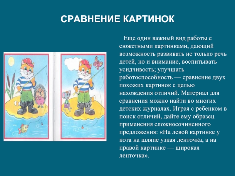 сюжетными картинками, дающий возможность развивать не только речь детей, но и внимание, воспитывать усидчивость; улучшать работоспособность — сравнение двух похожих картинок с целью нахождения отличий. Материал для сравнения можно найти во многих детских журналах. Играя с ребенком в поиск отличий, дайте ему образец применения сложносочиненного предложения: «На левой картинке у кота на шляпе узкая ленточка, а на правой картинке — широкая ленточка».