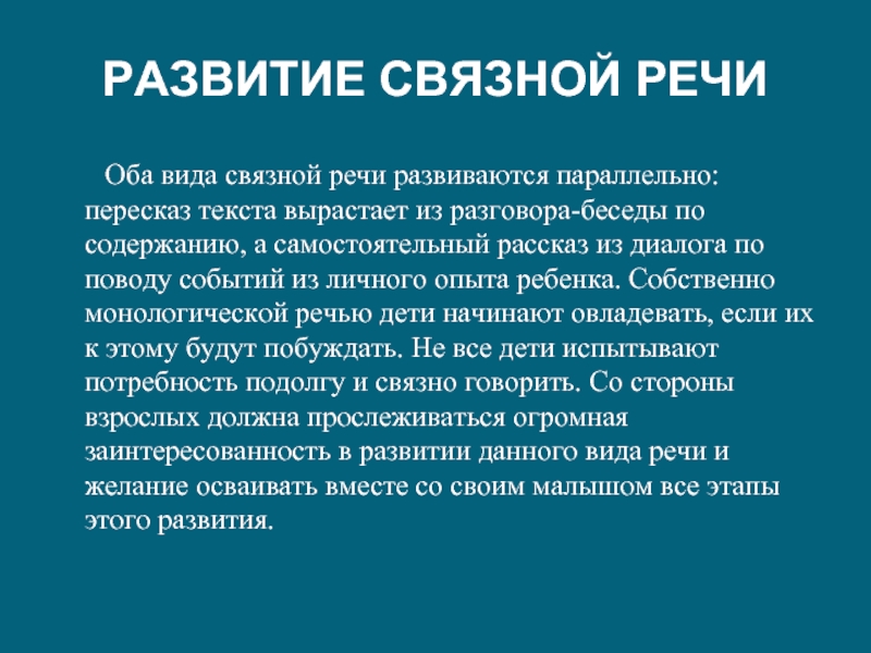 параллельно: пересказ текста вырастает из разговора-беседы по содержанию, а самостоятельный рассказ из диалога по поводу событий из личного опыта ребенка. Собственно монологической речью дети начинают овладевать, если их к этому будут побуждать. Не все дети испытывают потребность подолгу и связно говорить. Со стороны взрослых должна прослеживаться огромная заинтересованность в развитии данного вида речи и желание осваивать вместе со своим малышом все этапы этого развития.