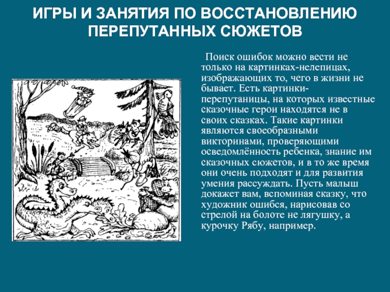 ошибок можно вести не только на картинках-нелепицах, изображающих то, чего в жизни не бывает. Есть картинки-перепутаницы, на которых известные сказочные герои находятся не в своих сказках. Такие картинки являются своеобразными викторинами, проверяющими осведомлённость ребенка, знание им сказочных сюжетов, и в то же время они очень подходят и для развития умения рассуждать. Пусть малыш докажет вам, вспоминая сказку, что художник ошибся, нарисовав со стрелой на болоте не лягушку, а курочку Рябу, например.