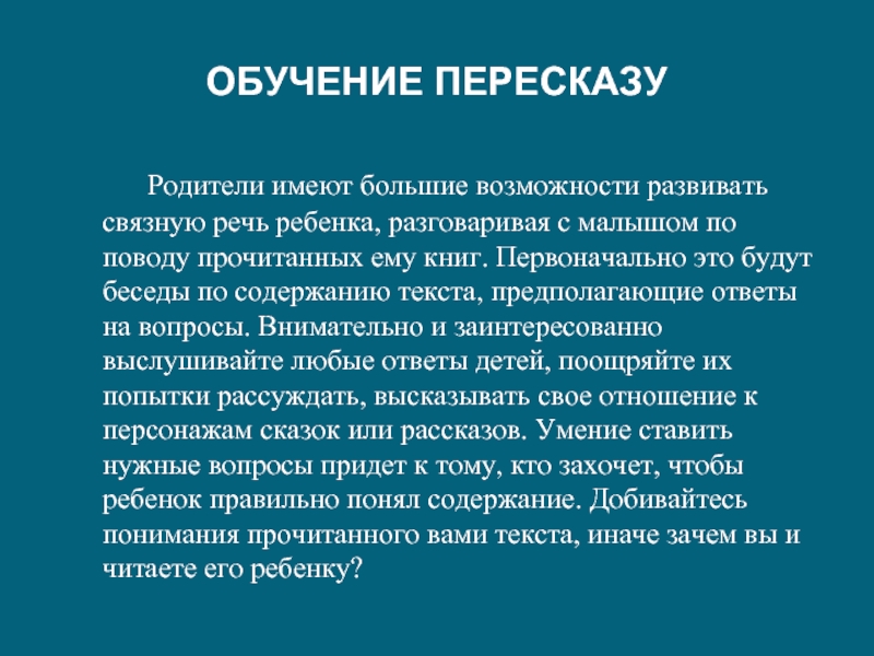 Слайд 9ОБУЧЕНИЕ ПЕРЕСКАЗУ