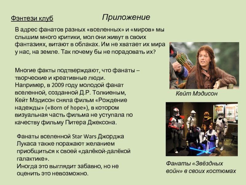 Кейт Мэдисон сняла фильм «Рождение надежды» («Born of hope»), в котором визуальная часть фильма не уступала по качеству фильму Питера Джексона.