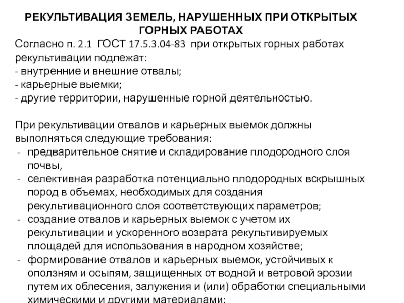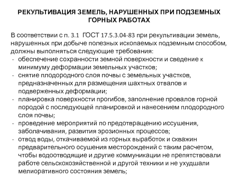 ГОСТ 17.5.3.04-83 при рекультивации земель, нарушенных при добыче полезных ископаемых подземным способом, должны выполняться следующие требования: