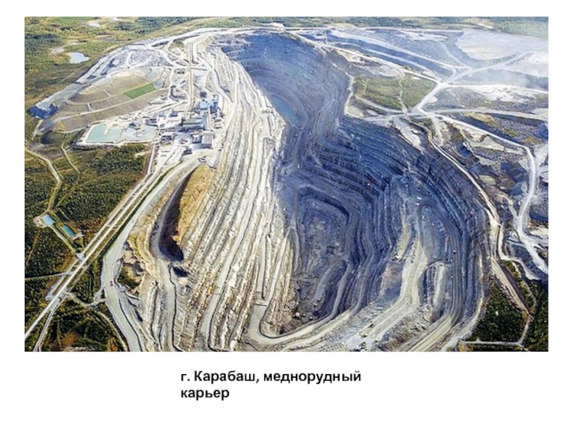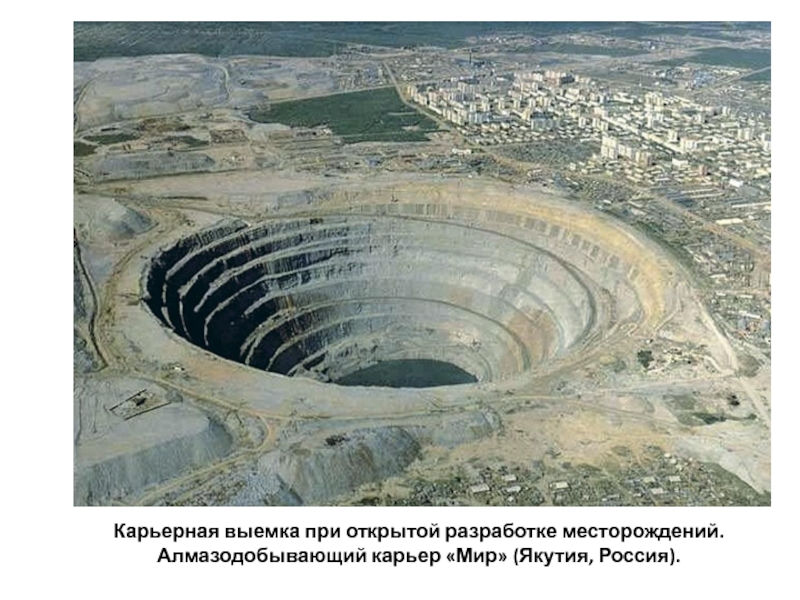 Слайд 10Карьерная выемка при открытой разработке месторождений. Алмазодобывающий карьер «Мир» (Якутия, Россия).
