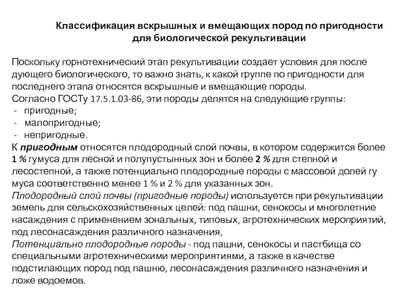 Слайд 46Классификация вскрышных и вмещающих пород по пригодности для биологической рекультивации
