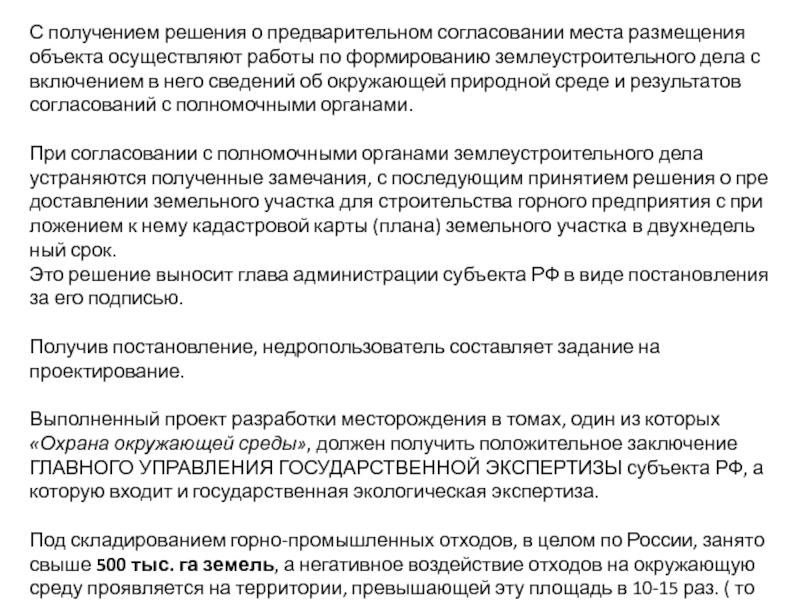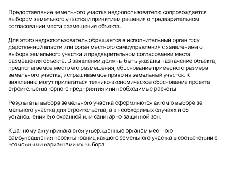 Слайд 7Предоставление земельного участка недропользователю сопровождается выбором земельного участка и принятием решения
