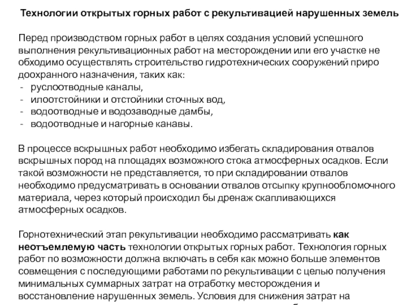 Горнотехнический этап рекультивации необходимо рассматривать как неотъемлемую часть технологии открытых горных работ. Технология горных работ по возможности должна включать в себя как можно больше элементов совмещения с последующими работами по рекультивации с целью получения минимальных суммарных затрат на отработку месторождения и восстановление нарушенных земель. Условия для снижения затрат на рекультивацию должны создаваться в процессе горных работ с учетом выполнения требований выбранного направления рекультивации.