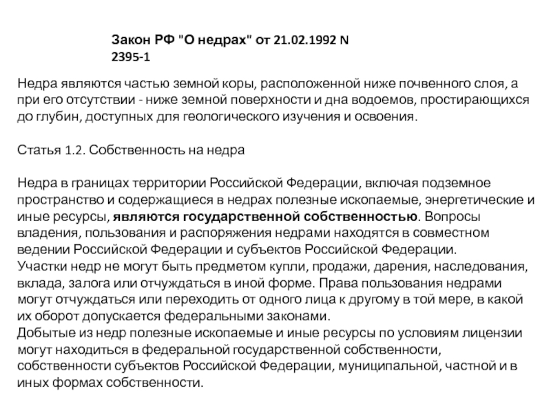 Слайд 3Закон РФ "О недрах" от 21.02.1992 N 2395-1