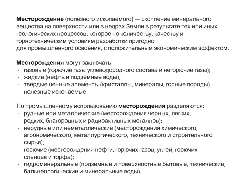 Слайд 2Месторождение (полезного ископаемого) — скопление минерального вещества на поверхности или в недрах Земли в результате