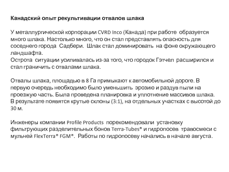 Слайд 70Канадский опыт рекультивации отвалов шлака