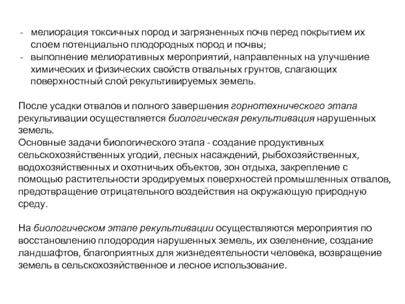 рекультивированных земель. В случае их наличия на поверхности необходима коренная химическая мелиорация, создание экрана из нейтрализующих токсичные свойства пород, перекрытие потенциально плодородными породами мощностью, обеспечивающей нормальное развитие растений в данных природно-климатических условиях.