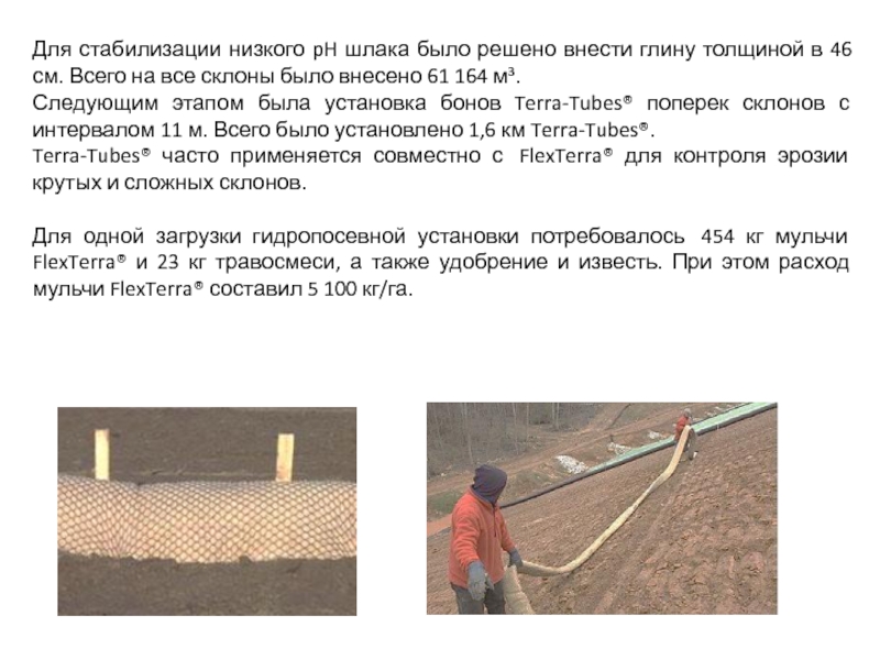 Слайд 71Для стабилизации низкого pH шлака было решено внести глину толщиной в