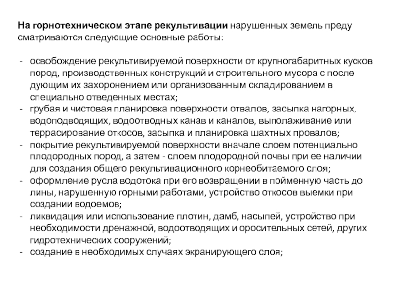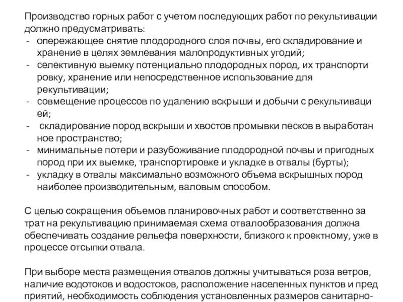 Слайд 51Производство горных работ с учетом последующих работ по рекультивации должно предусматривать: