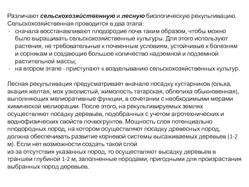 Слайд 45Различают сельскохозяйственную и лесную биологическую рекультивацию. Сельскохозяйственная проводится в два этапа:
