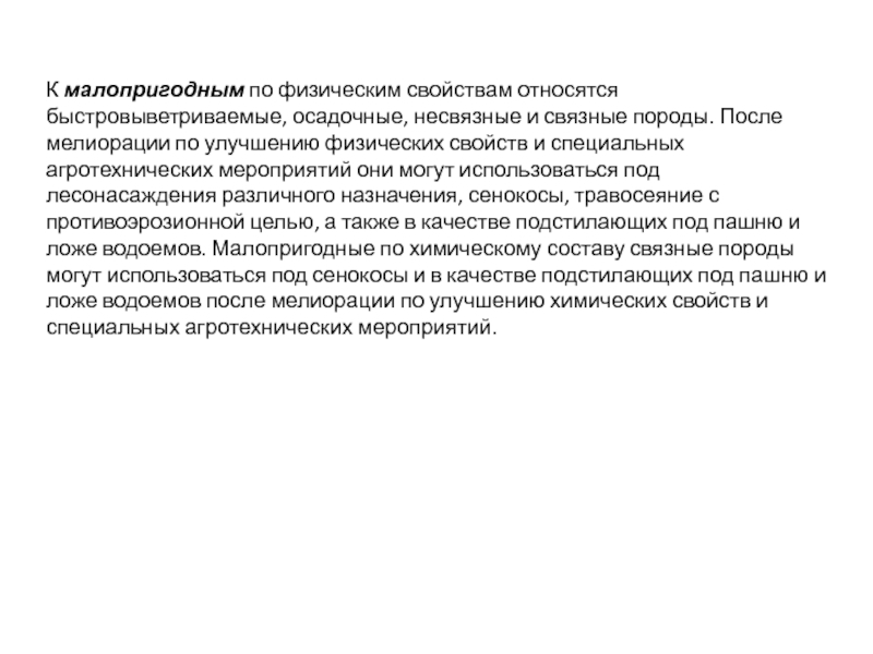породы. После мелиорации по улучшению физических свойств и специальных агротехнических мероприятий они могут использоваться под лесонасаждения различного назначения, сенокосы, травосеяние с противоэрозионной целью, а также в качестве подстилающих под пашню и ложе водоемов. Малопригодные по химическому составу связные породы могут использоваться под сенокосы и в качестве подстилающих под пашню и ложе водоемов после мелиорации по улучшению химических свойств и специальных агротехнических мероприятий.