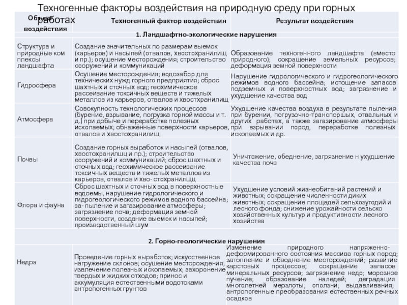 Слайд 37Техногенные факторы воздействия на природную среду при горных работах