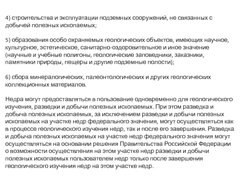 Недра могут предоставляться в пользование одновременно для геологического изучения, разведки и добычи полезных ископаемых. При этом разведка и добыча полезных ископаемых, за исключением разведки и добычи полезных ископаемых на участке недр федерального значения, могут осуществляться как в процессе геологического изучения недр, так и после его завершения. Разведка и добыча полезных ископаемых на участке недр федерального значения могут осуществляться на основании решения Правительства Российской Федерации о возможности осуществления на этом участке недр разведки и добычи полезных ископаемых пользователем недр только после завершения геологического изучения недр на этом участке недр.