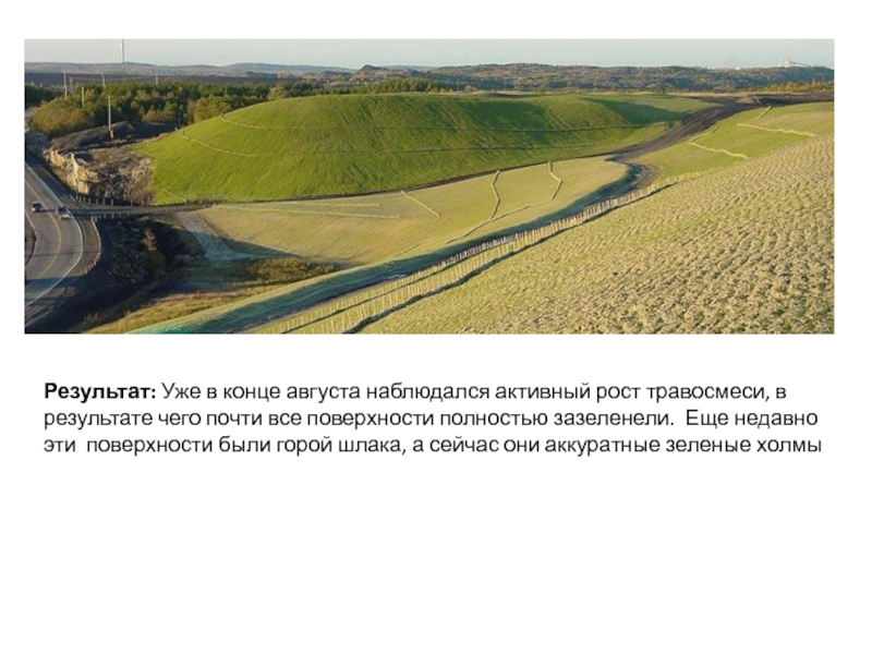 почти все поверхности полностью зазеленели. Еще недавно эти поверхности были горой шлака, а сейчас они аккуратные зеленые холмы