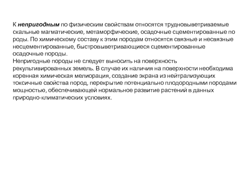 Слайд 48К непригодным по физическим свойствам относятся трудновыветриваемые скальные магматические, метаморфические, осадочные