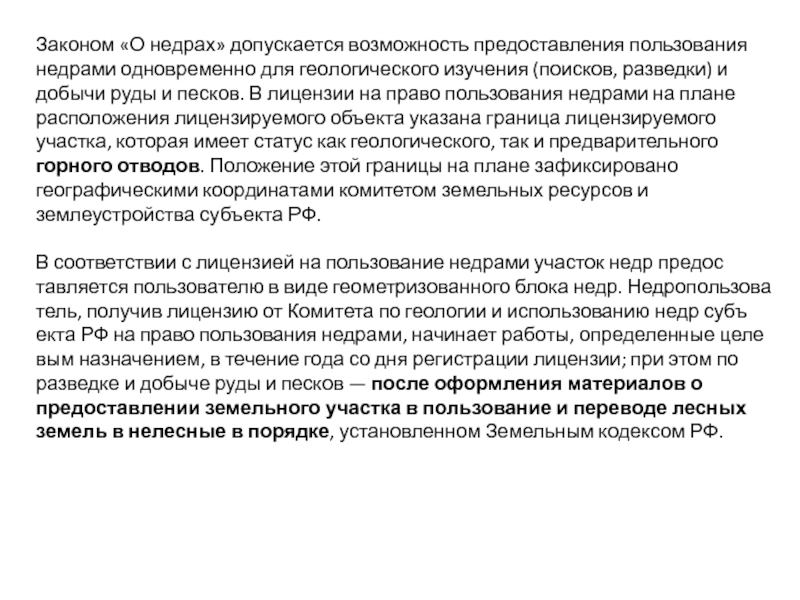 Слайд 6Законом «О недрах» допускается возможность предоставления пользования недрами одновременно для геологического