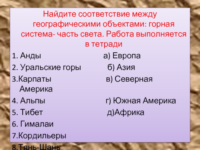 Слайд 7Найдите соответствие между географическими объектами: горная система- часть света. Работа выполняется