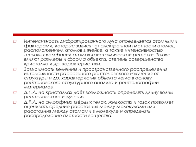 атомов, расположением атомов в ячейке, а также интенсивностью тепловых колебаний атомов кристаллической решётки. Также влияют размеры и форма объекта, степень совершенства кристалла и др. характеристики.