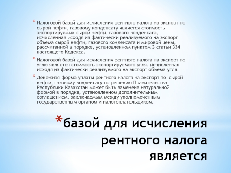 на экспорт по сырой нефти, газовому конденсату является стоимость экспортируемых сырой нефти, газового конденсата, исчисленная исходя из фактически реализуемого на экспорт объема сырой нефти, газового конденсата и мировой цены, рассчитанной в порядке, установленном пунктом 3 статьи 334 настоящего Кодекса.