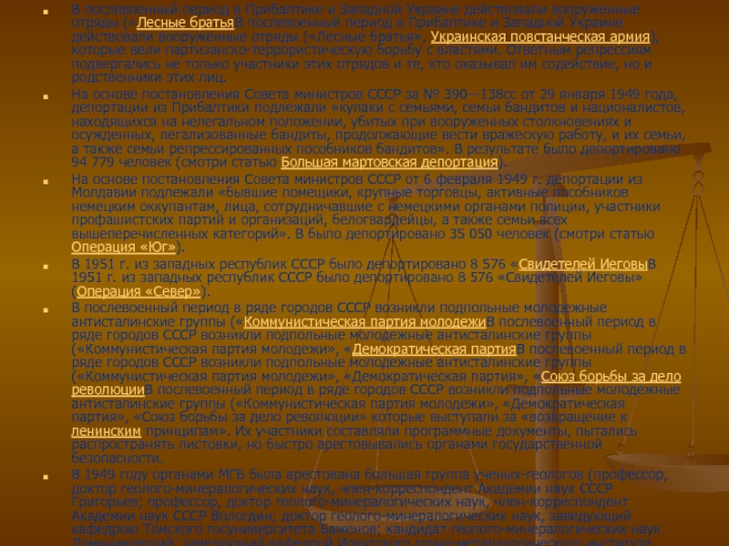 («Лесные братьяВ послевоенный период в Прибалтике и Западной Украине действовали вооруженные отряды («Лесные братья», Украинская повстанческая армия), которые вели партизанско-террористическую борьбу с властями. Ответным репрессиям подвергались не только участники этих отрядов и те, кто оказывал им содействие, но и родственники этих лиц.