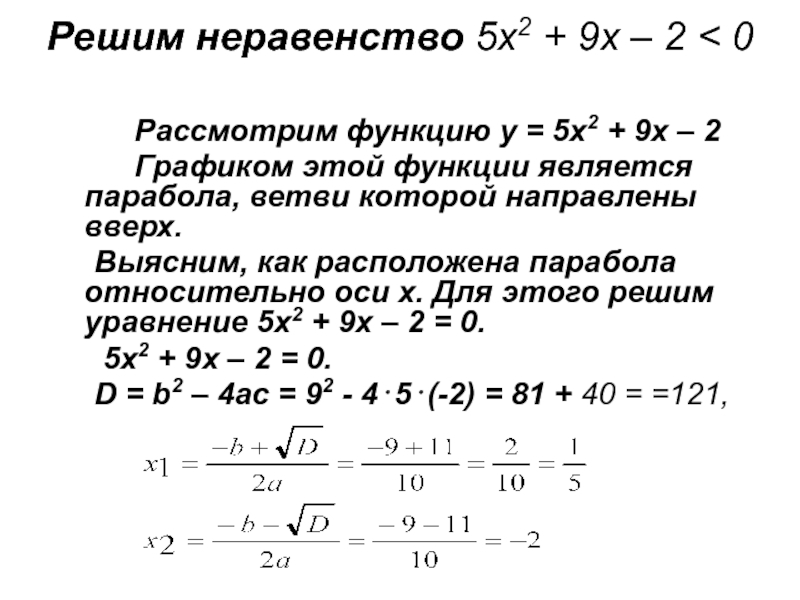 Выясним, как расположена парабола относительно оси х. Для этого решим уравнение 5х2 + 9х – 2 = 0.